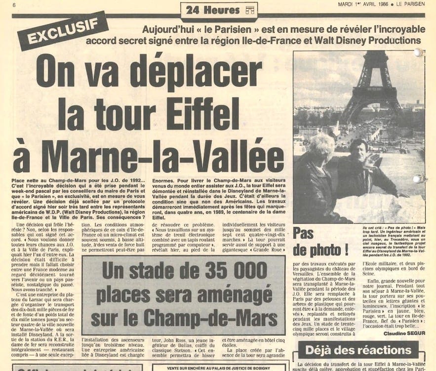 French media have traditionally engaged in April Fish Day hoaxes. Some years ago, daily newspaper Le Parisien announced that Walt Disney Productions had secretly bought the Eiffel Tower and planned to move it to a construction site east of Paris (where Disneyland Paris stands today). This “news” was met with equal parts outrage and laughter.