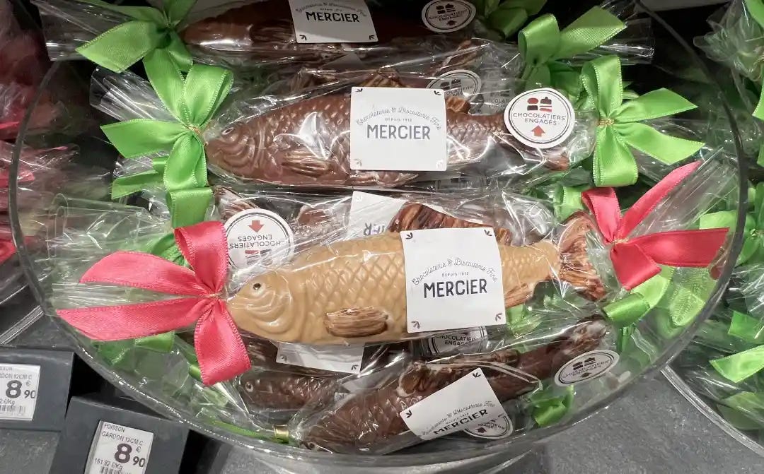Since Easter often falls in April, the holiday can be quite “fishy.” Shops stock chocolate fish, bells, and hens. The fish may signal the end of Lent or refer to the Biblical story of Jesus Christ multiplying the fish. Church bells supposedly sprout wings and fly to the Vatican for eggs, which they drop on the way back, prompting Easter egg hunts. (In the Alsace region, chocolate bunnies reportedly lay eggs.)