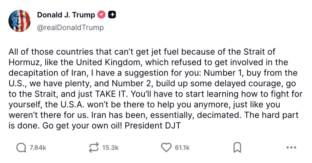 French President Emmanuel Macron: “France is ready to escort ships and tankers in the Strait of Hormuz once the situation is ‘calmer,’ but that mission must be entirely separate from the ongoing war operations and bombings.”